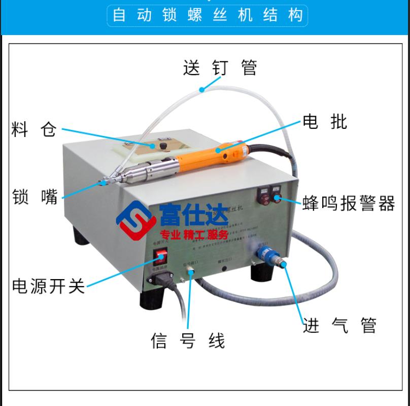 鎖付系統通過多道感應和程序控制,與送釘機通信,擰一顆螺絲,送釘機送一顆螺絲,不會卡料,日常操作只需要不停下壓電批即可,設備自動輸送螺絲自動擰緊。